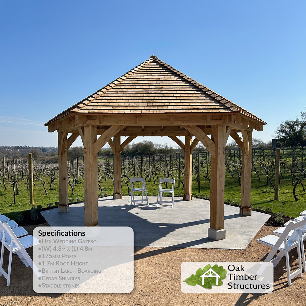Oak gazebos are usually made from constructional grade fresh sawn, or green oak. The slight shrinkage as it dries is relied upon to pull the jointing tighter.